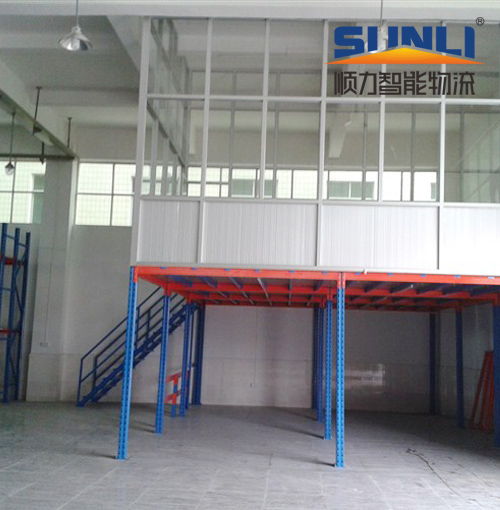 Double use of ground space, improve space utilization, reduce operating costs. According to the warehouse space design platform (3000~6000mm), maximum span weight can reach 1000KG/ square meters, usually collocations lifting platform of goods, efficiency. The floor is spacious, equipped with guardrail, and easy to move up and down stairs. The platform panel can be made of wood board, steel plate or steel gusset plate. The utility model has the advantages of integral appearance, stable structure, safety and disassembly.